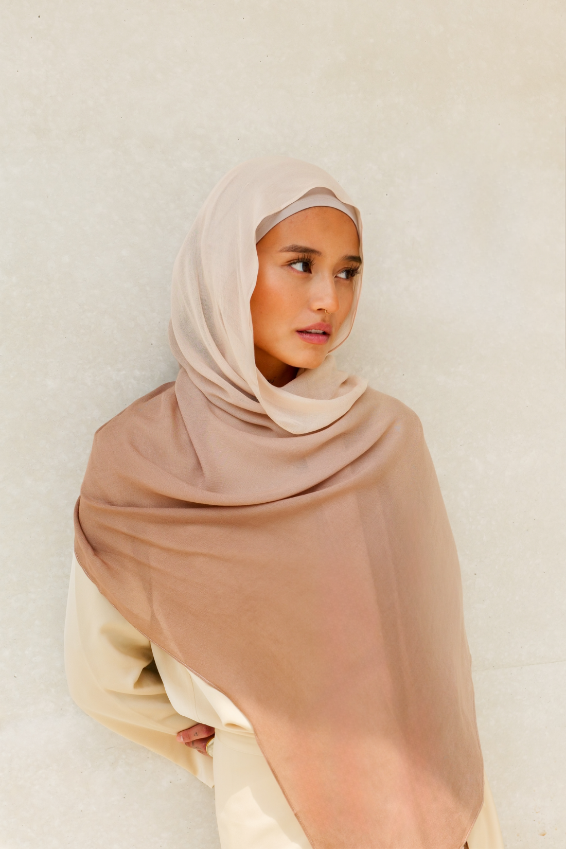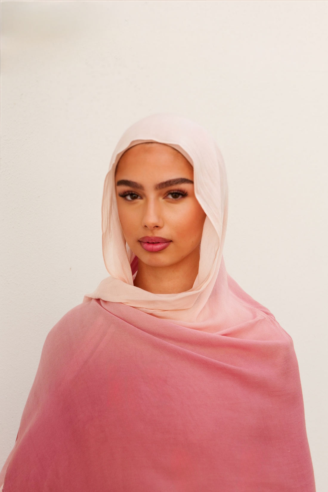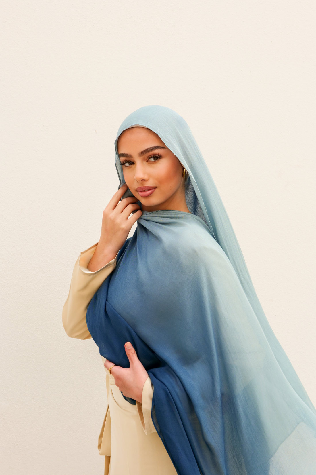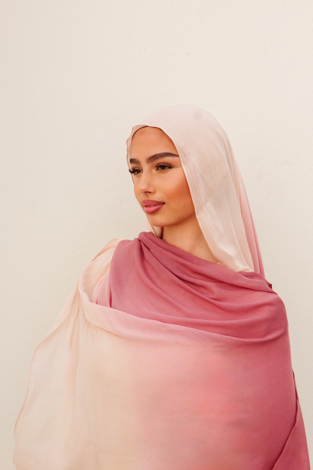Zart und fließend - unsere Ombre-Kollektion vereint pure Eleganz mit müheloser Tragbarkeit. Inspiriert von der Leichtigkeit warmer Sommertage und dem Gefühl von sanftem Wind auf der Haut, ist jeder Hijab ein Hauch von Freiheit.