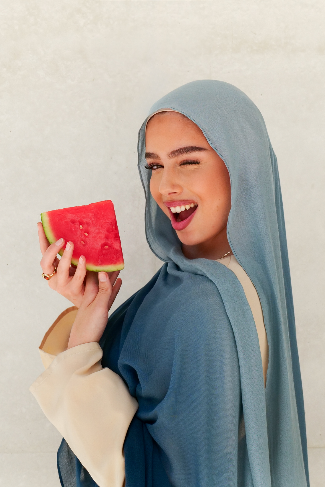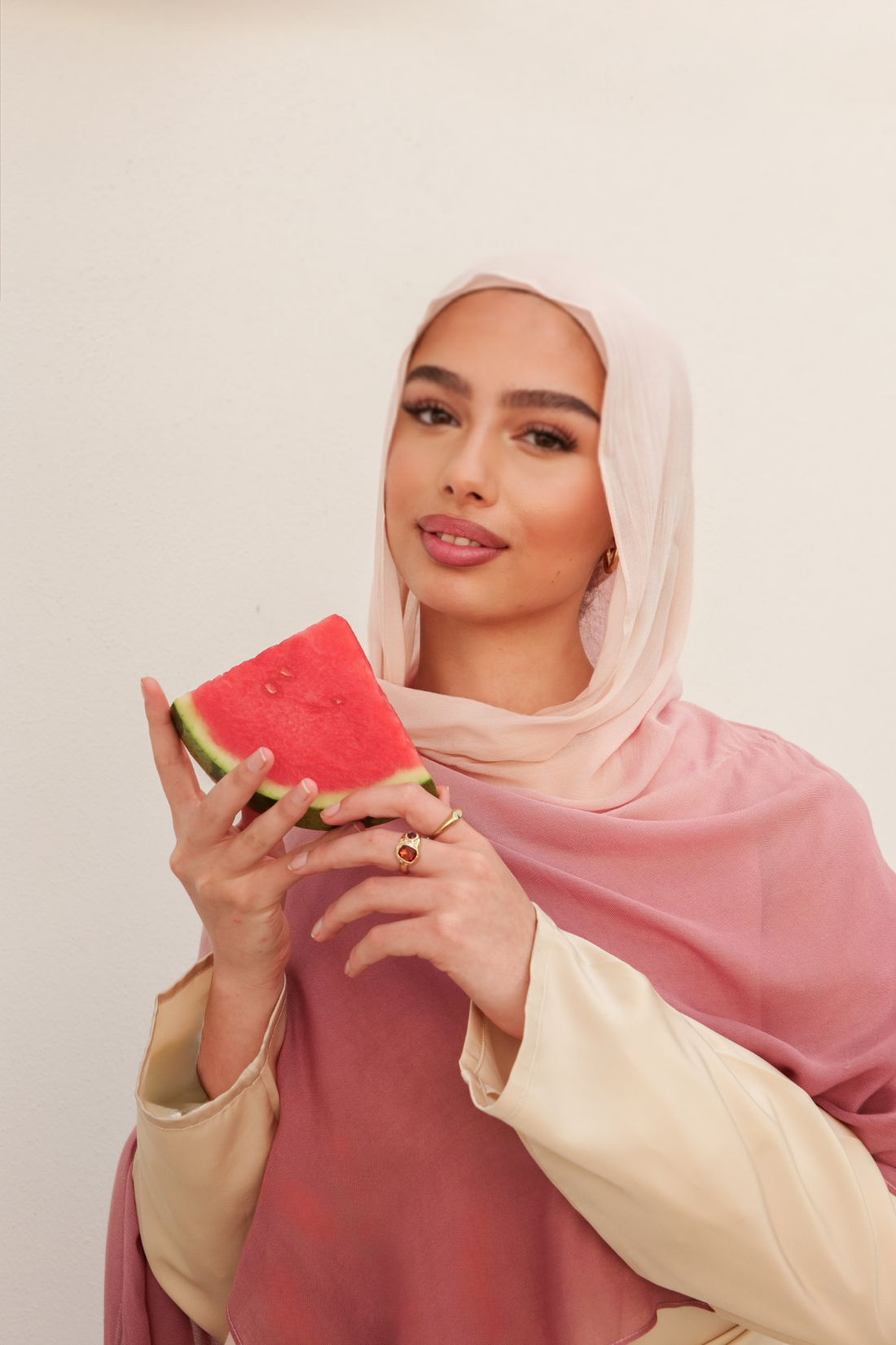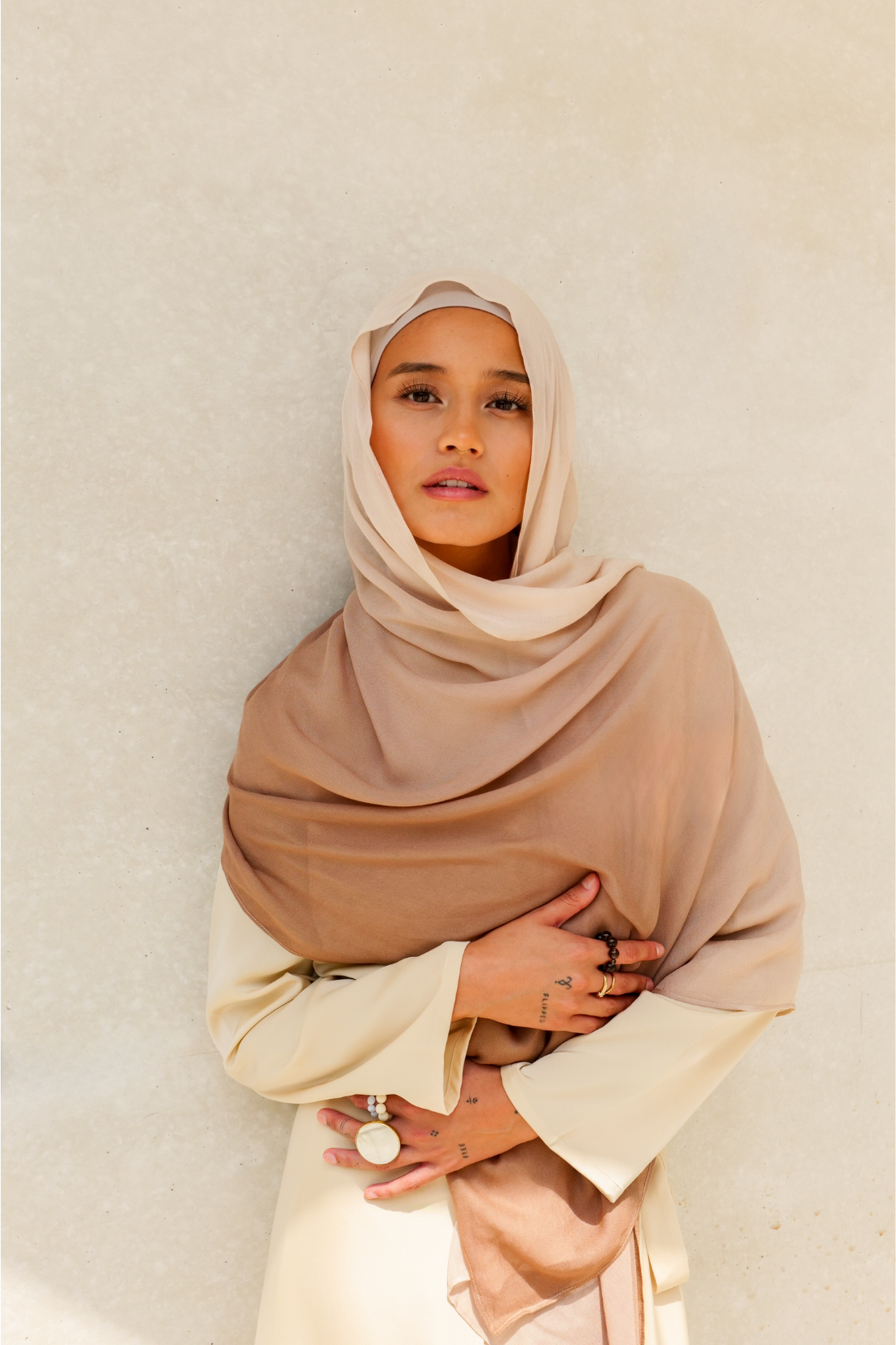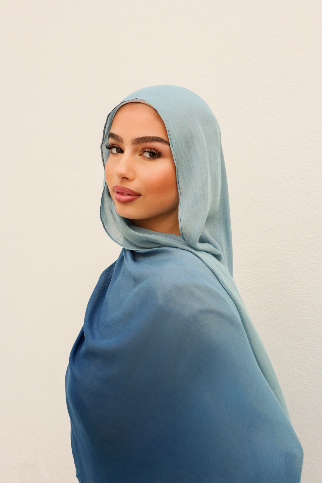 Zart und fließend - unsere Ombre-Kollektion vereint pure Eleganz mit müheloser Tragbarkeit. Inspiriert von der Leichtigkeit warmer Sommertage und dem Gefühl von sanftem Wind auf der Haut, ist jeder Hijab ein Hauch von Freiheit.