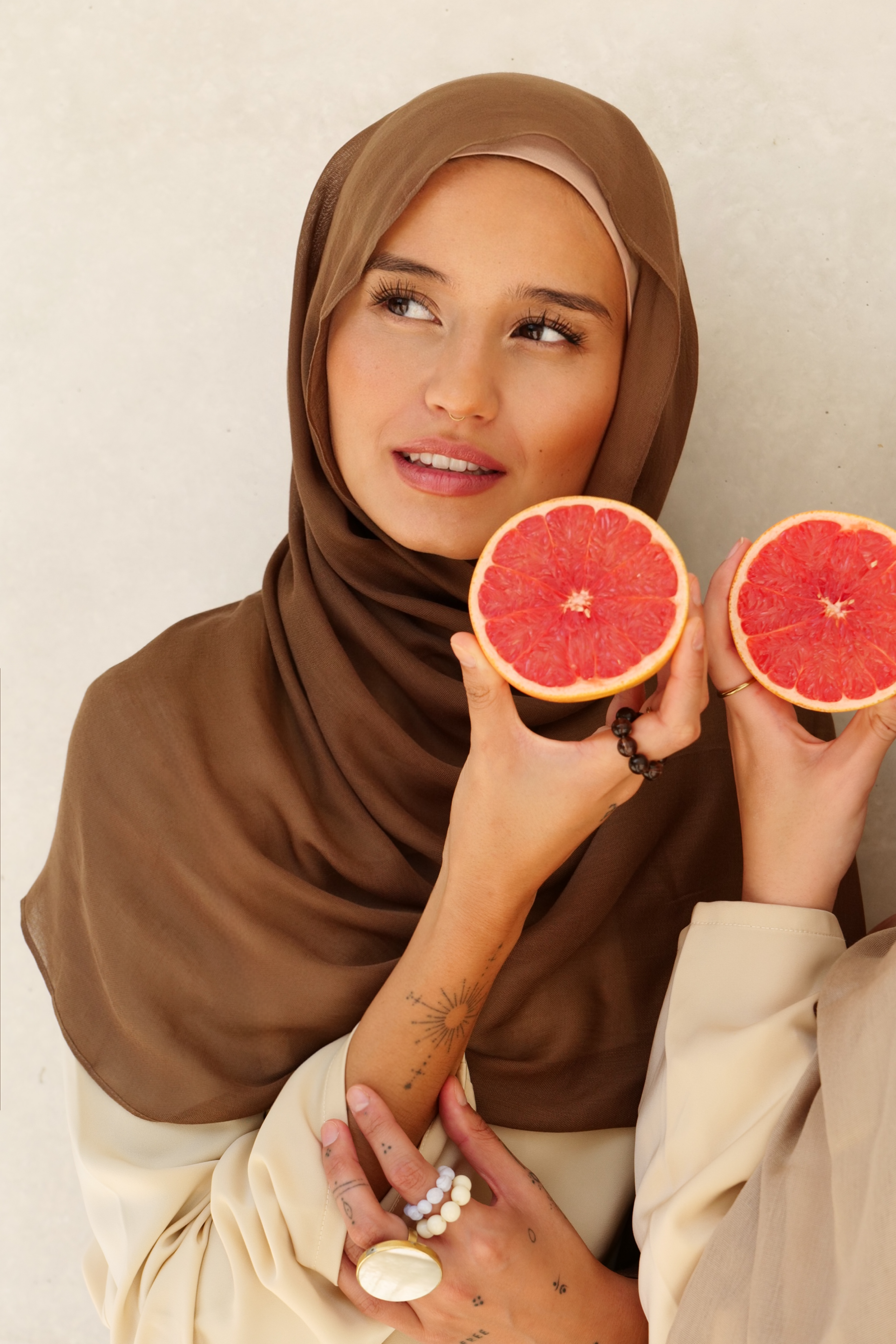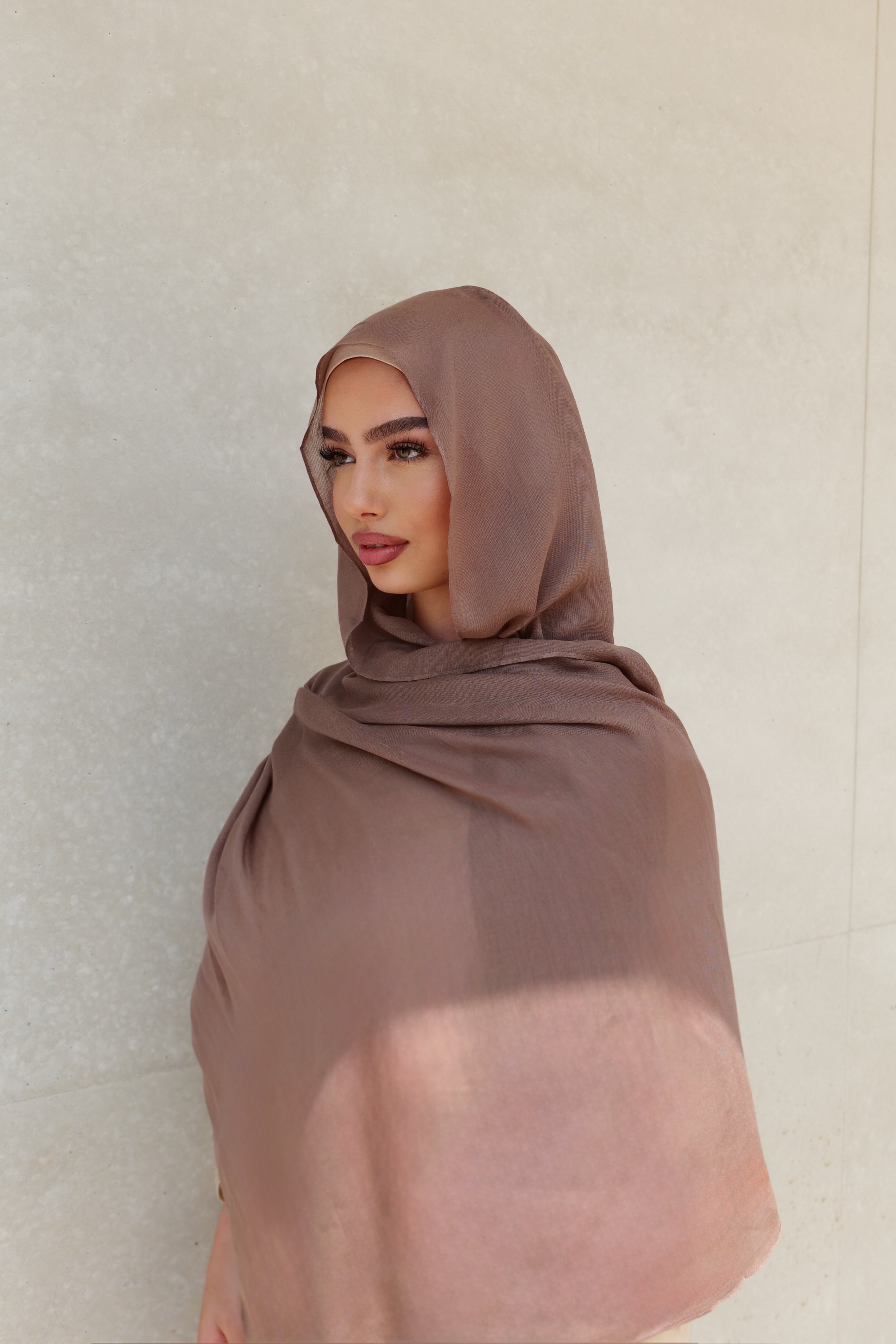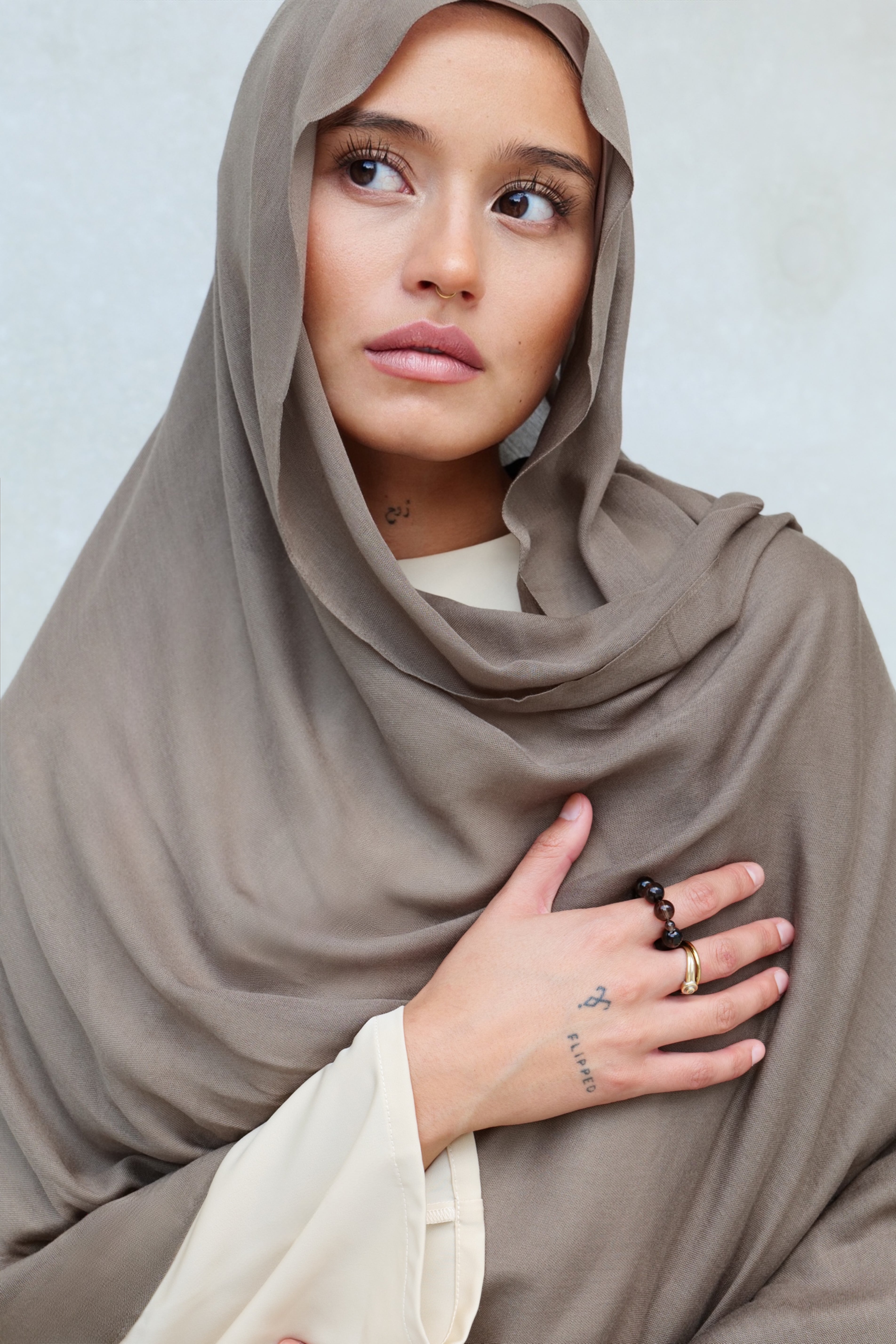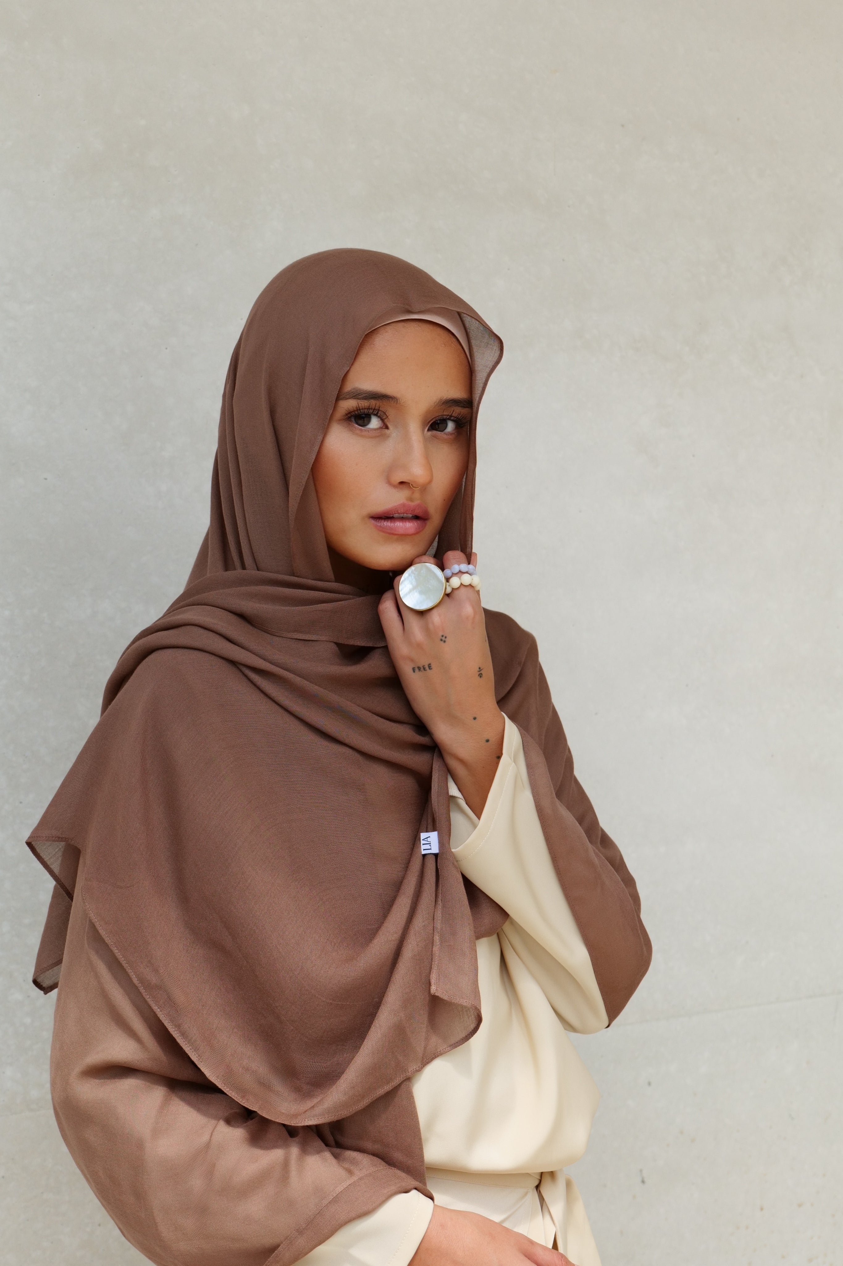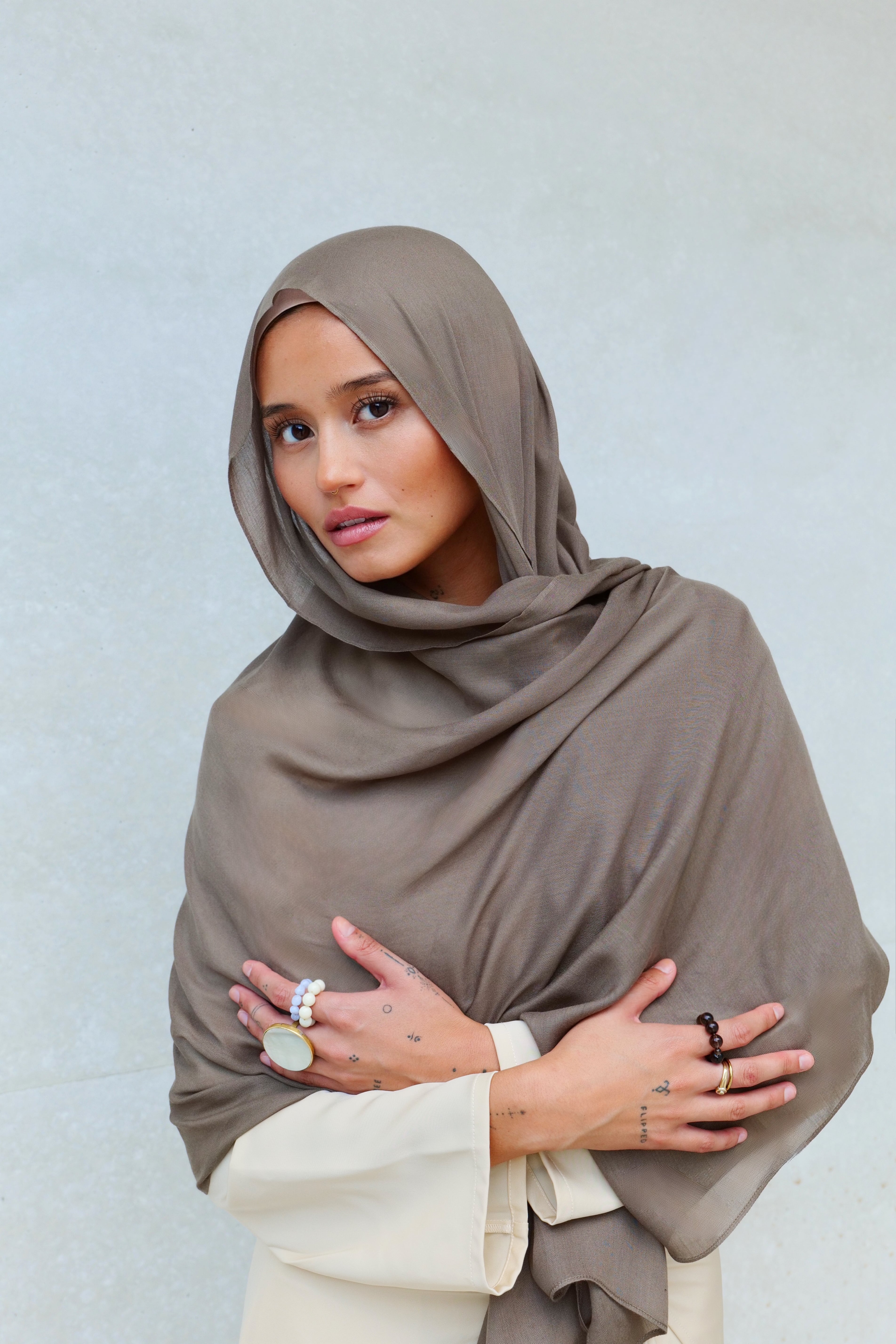 Zurückhaltend, edel und leicht - diese Kollektion setzt auf sanfte Naturtöne und ein angenehmes Tragegefühl. Die Hijabs bestehen aus 100% Modal, einem besonders weichen und atmungsaktiven Stoff, der sich fast schwerelos anfühlt.