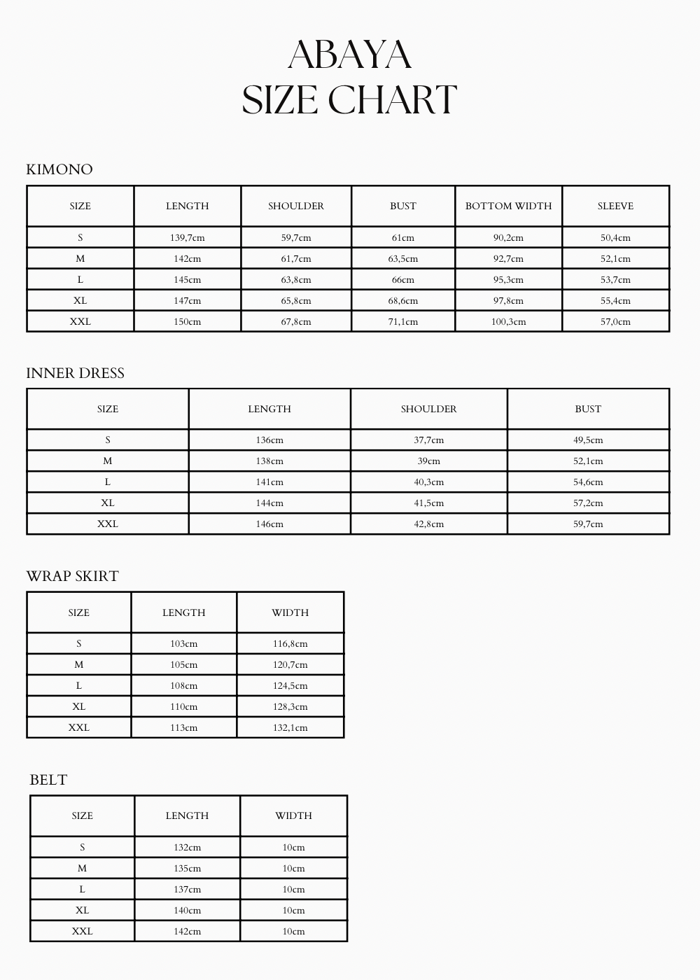 Das Unterkleid ist schlicht und elegant, eine ideale Basis für zahlreiche Kombinationen. Der Kimono ergänzt das Outfit mit seiner fließenden Silhouette und kann sowohl offen als auch geschlossen getragen werden. Entscheide dich je nach Anlass für den Gürtel, der deiner Taille schmeichelt und dem Look Struktur verleiht, oder für den Wickelrock, der deinen zusätzlichen Akzent setzt.